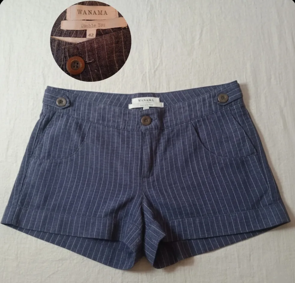 Shorts de vestir a rayas verticales, con bolsillos delanteros y traseros. Detalle de botones en la cintura y en los bolsillos traseros. Ideales para un look canchero y elegante.