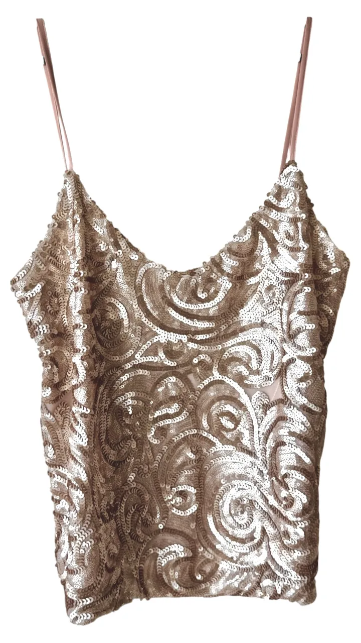 Top de fiesta con lentejuelas doradas y diseño de espirales. Ideal para eventos nocturnos o celebraciones especiales.