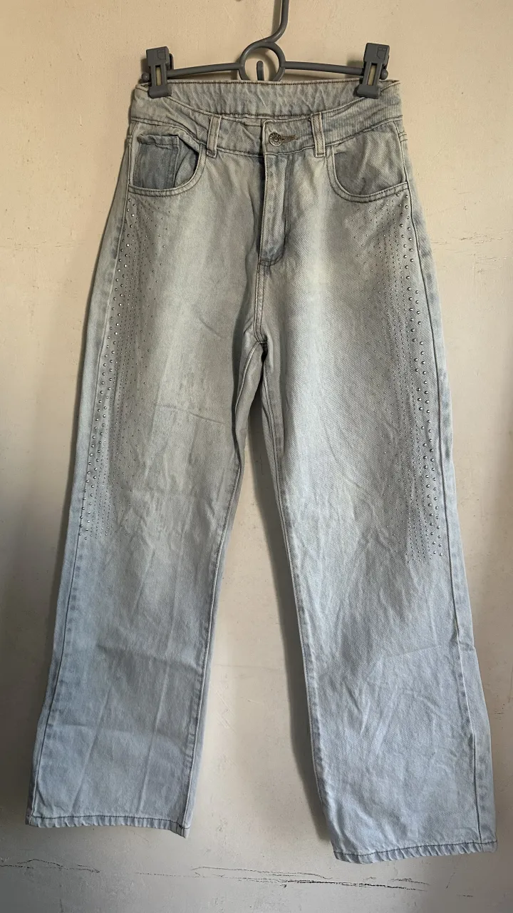 Jean de tiro alto, wide leg, rigido con brillitos. celeste claro talle 38, tiene unas manchitas que se ven en la ultima foto