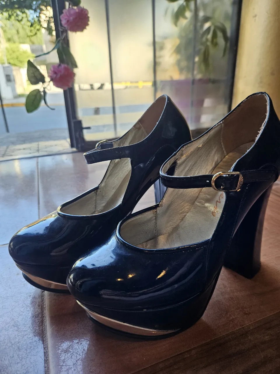 Zapatos negros de charol con plataforma y tira en el tobillo. Tienen un taco grueso y alto.