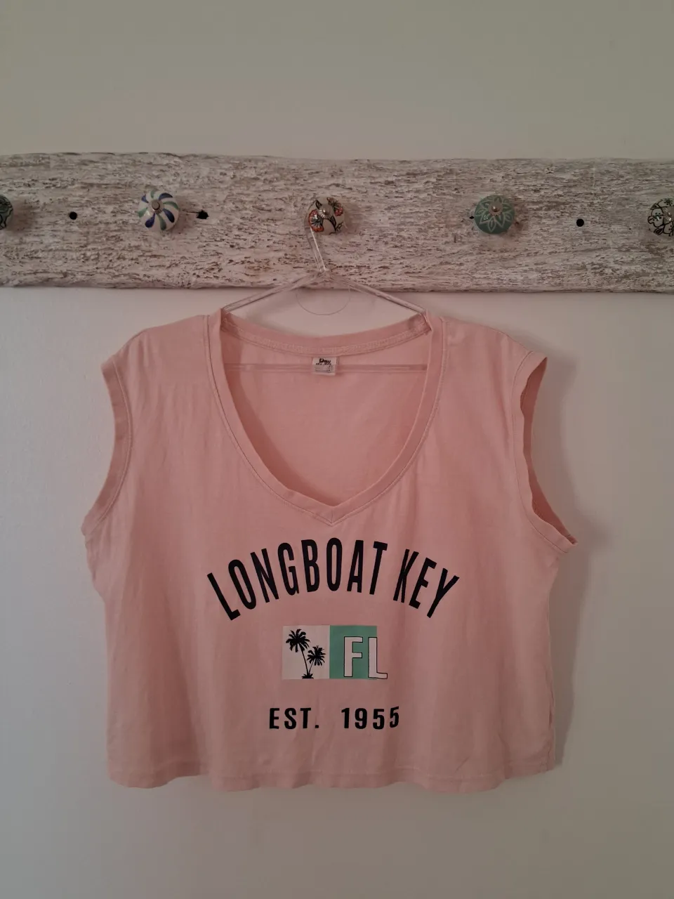 Musculosa de algodón cuello en v color rosa claro con estampa en la parte delantera. Talle L. Medidas: axila a axila 56 cm, largo 48 cm.