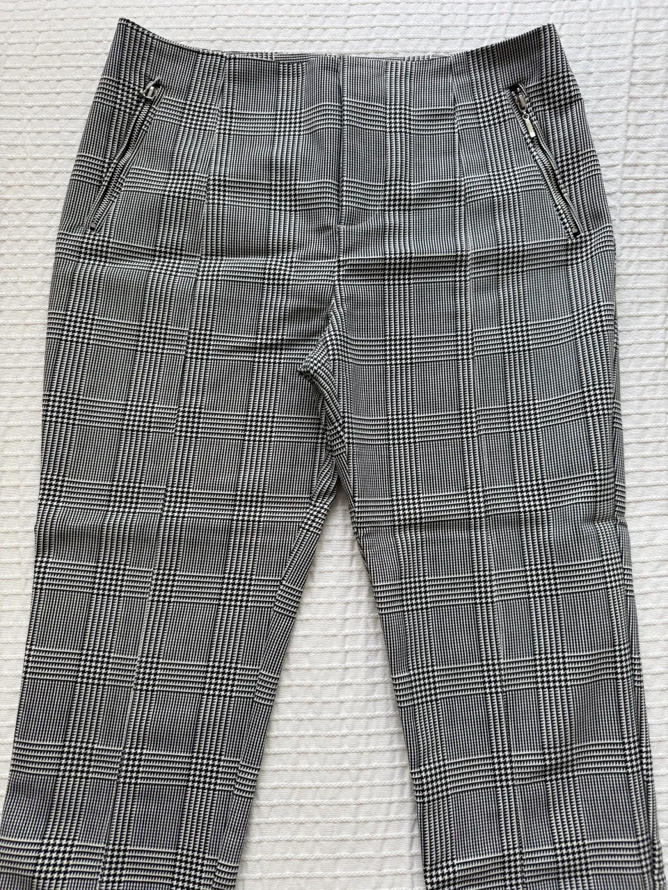 Pantalón a cuadros escoceses en blanco y negro. Posee bolsillos delanteros con cierre y bolsillos traseros. Cierre y botón en la parte delantera.