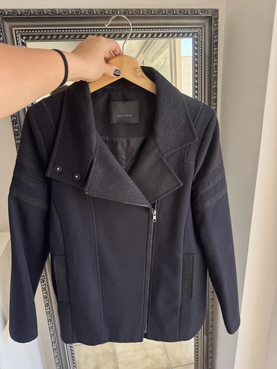 Abrigo tapado negro de paño con cuello solapa y cierre asimétrico. Posee dos bolsillos frontales con solapa y detalles de costuras en las mangas. Tiene dos tipos de paño por eso las diferentes texturas
