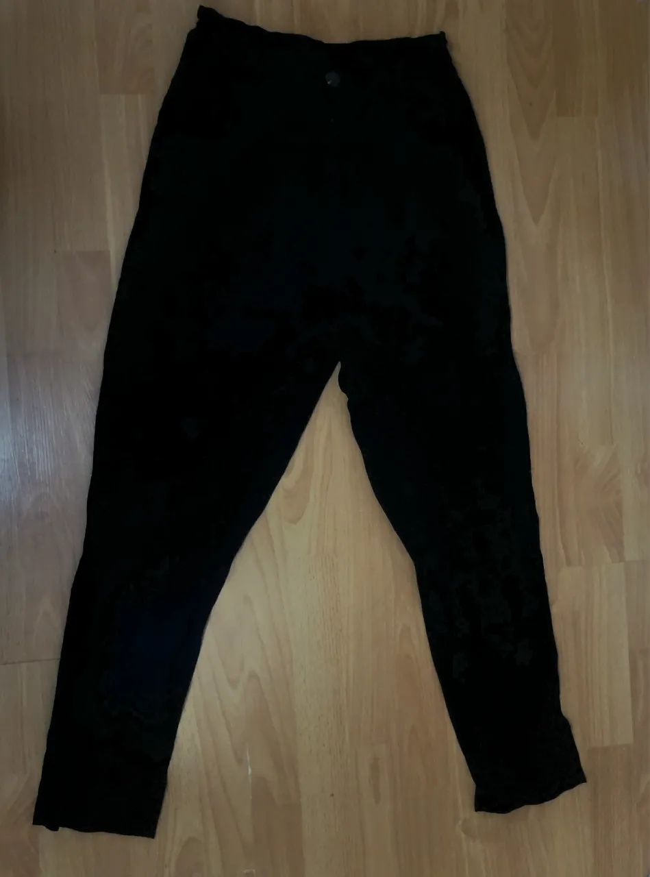 Pantalón negro, estilo sastrero, al cuerpo. Muy fresco y con frunce en la cintura. Tiene bolsillos adelante y atrás. Talle M. 60% poliester, 40% algodón