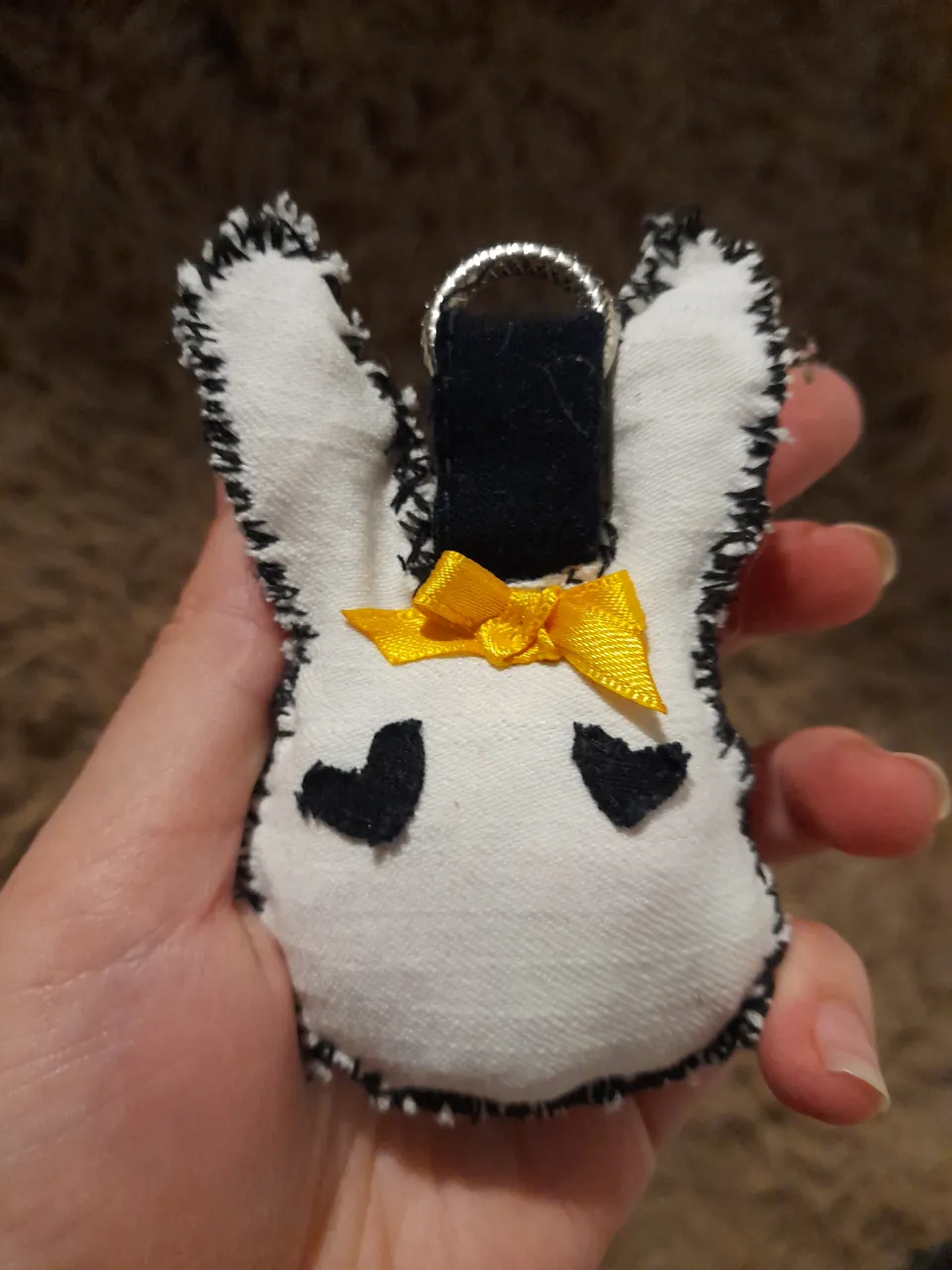 Llavero de conejo hecho a mano con retazos, ideal para darle un toque único a tu mochila o llaves. Cada pieza es irrepetible.