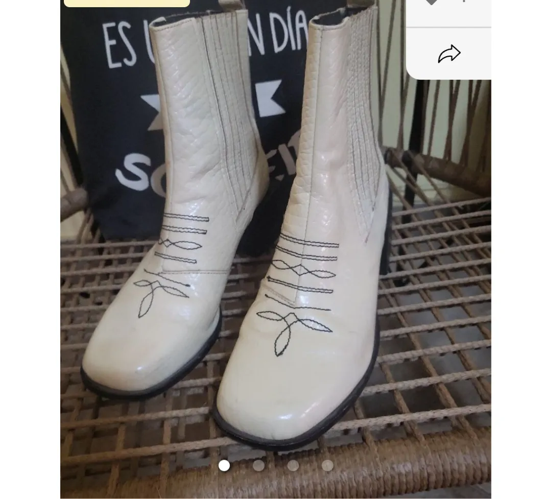 Botas de caña baja color crema con detalles de costura negra y textura de escamas.