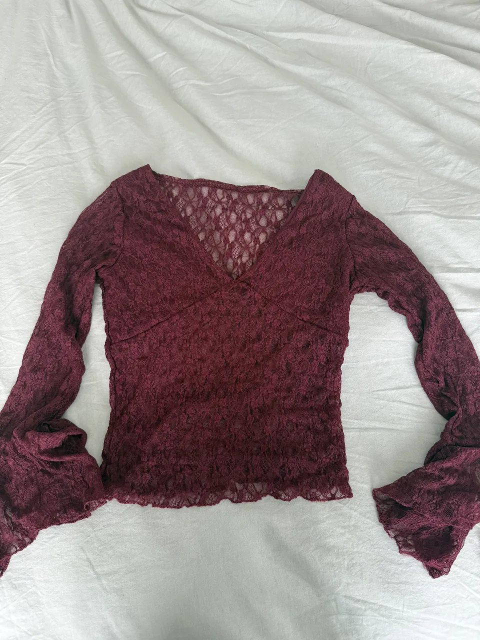 Blusa de encaje color bordó con mangas largas acampanadas y escote en V. Está sin uso!