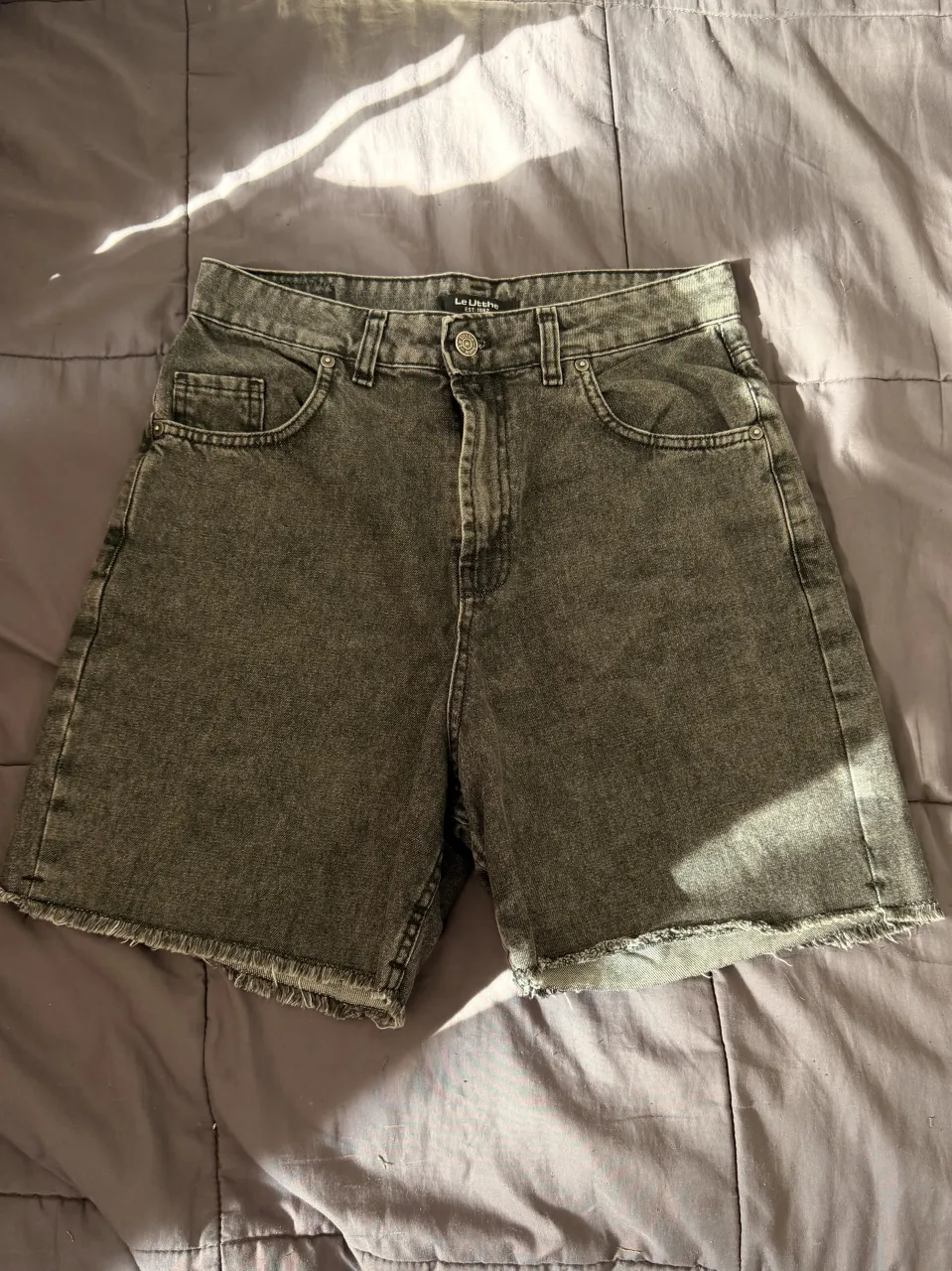 Bermuda de jean (Le Utthe) gris oscuro con roturas y flecos en el ruedo. Posee bolsillos delanteros y traseros.