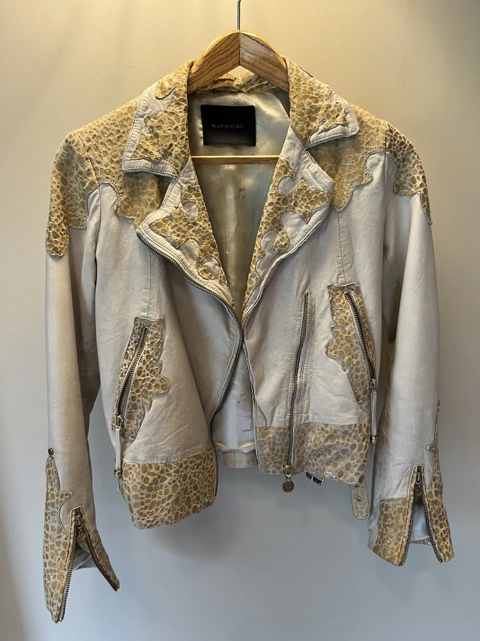 Campera de cuero color crudo con detalles de estampado animal print en cuello, mangas y cintura. Posee cierres en los bolsillos y en los puños de las mangas. Cierre principal frontal.