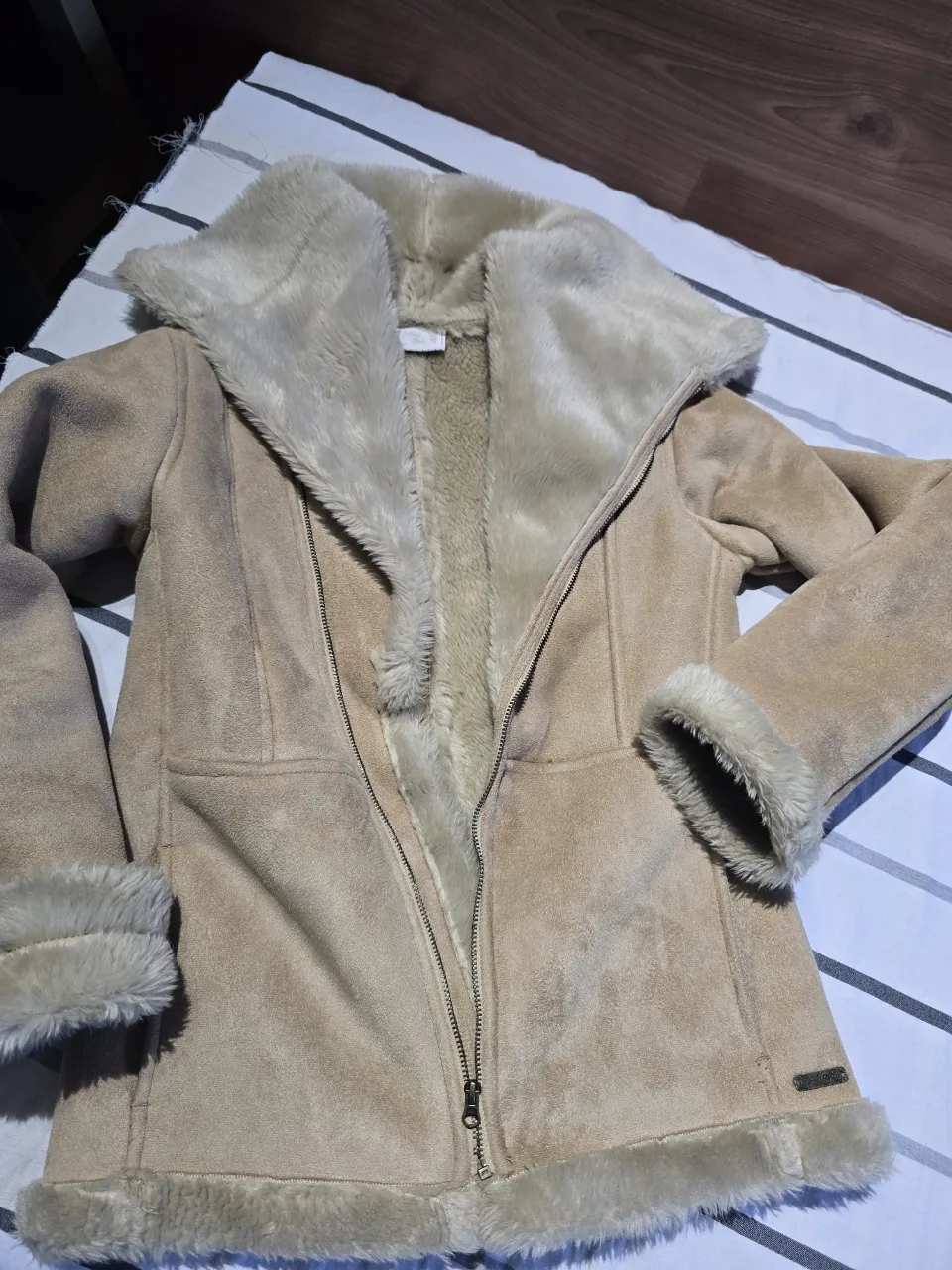 Campera de gamuza sintética forrada en piel sintética súper suave y abrigada. Posee cuello alto con solapa de piel, cierre metálico y bolsillos laterales. Ideal para los días fríos, con un estilo canchero y moderno. solo tiene roto el cierre pero esta impecable