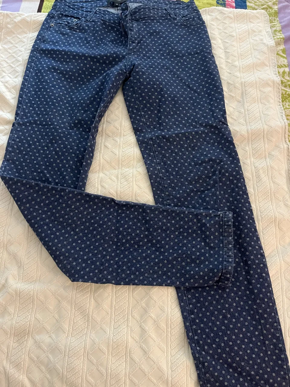 Jeans tiro alto con estampa de lunares pequeños. Un clásico que nunca pasa de moda, ideal para looks casuales y cancheros.