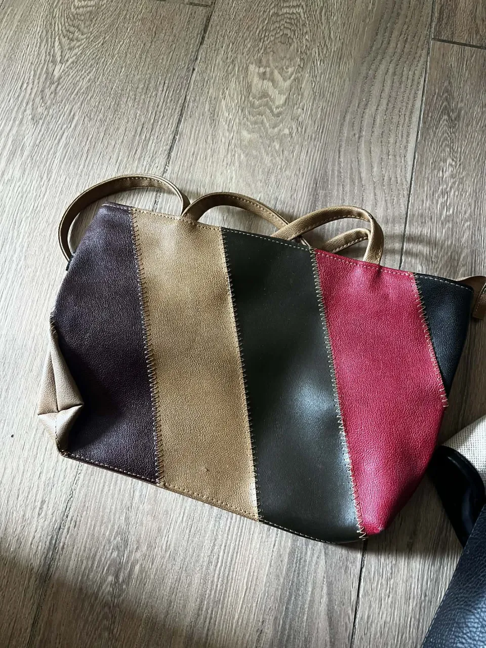 Bolso de cuero sintético con diseño de parches en franjas verticales. Las franjas son de color marrón oscuro, beige, verde oscuro, rojo y negro. Tiene dos asas cortas para llevar en la mano o al hombro.