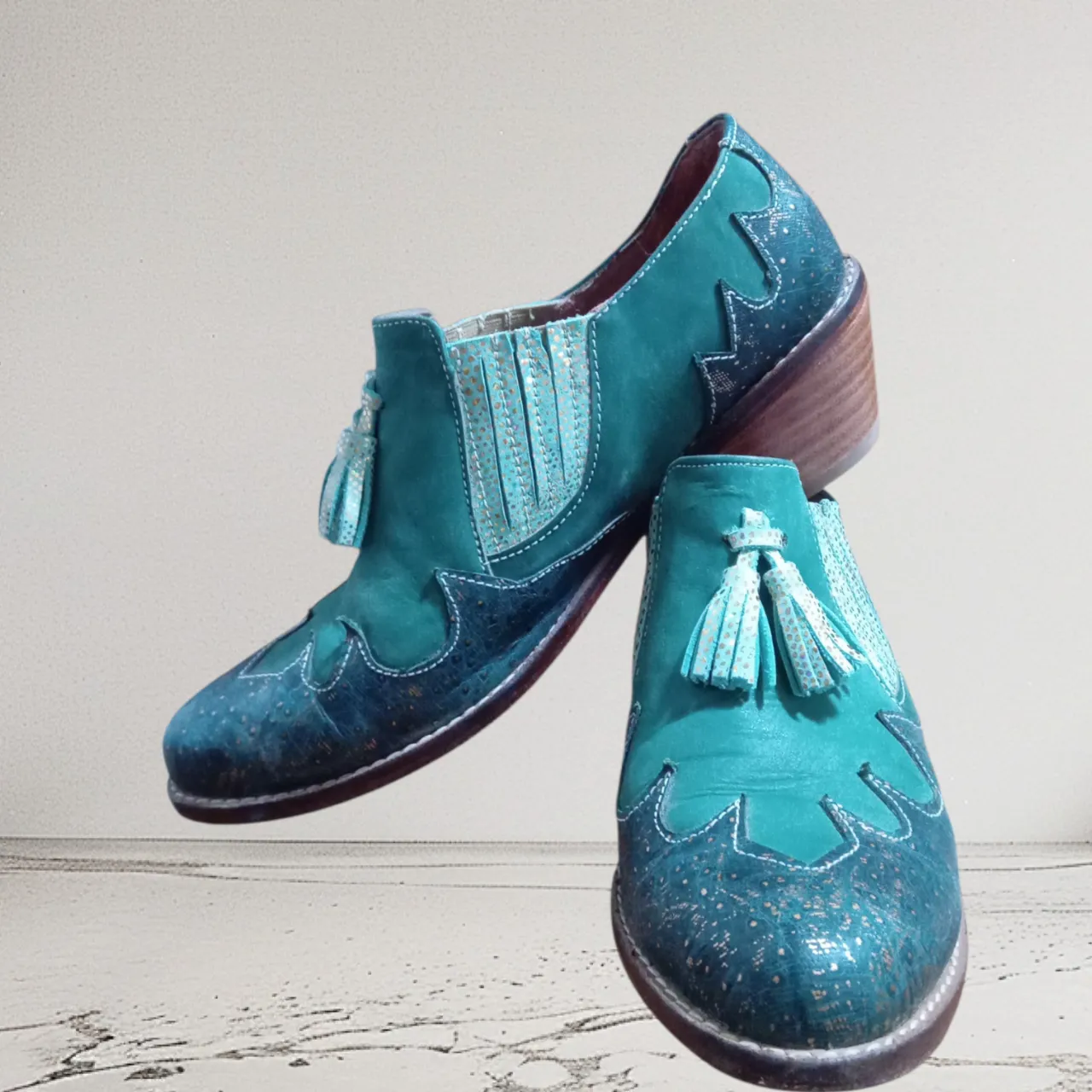 Botitas de cuero verde turquesa con detalles en dorado y flecos. Un diseño único y original para darle un toque canchero a tu look.