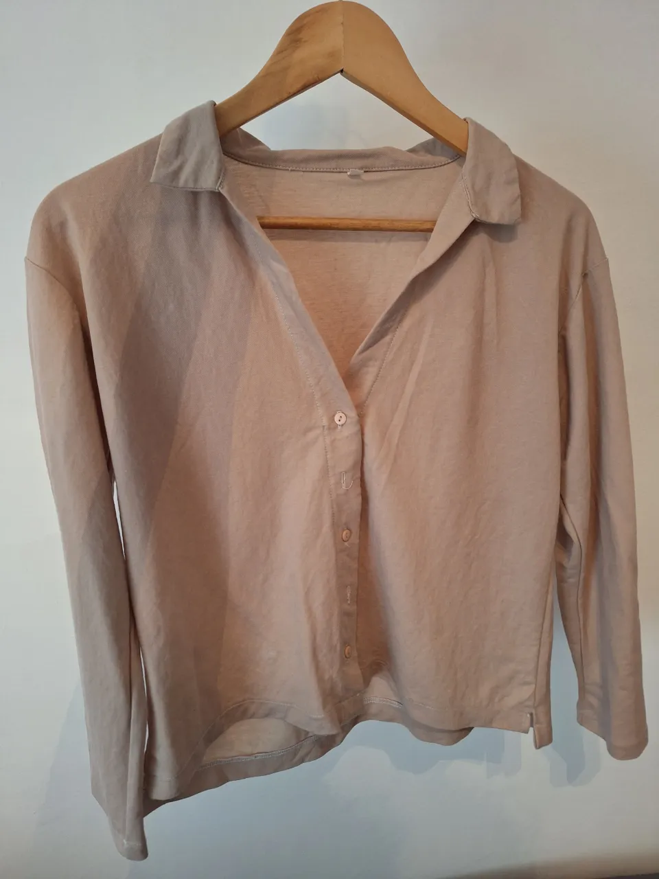 Camisa manga larga color beige, con botones al frente y cuello camisero. Ideal para un look casual y cómodo. Detalle en la parte de atrás de la manga derecha (ver última foto).