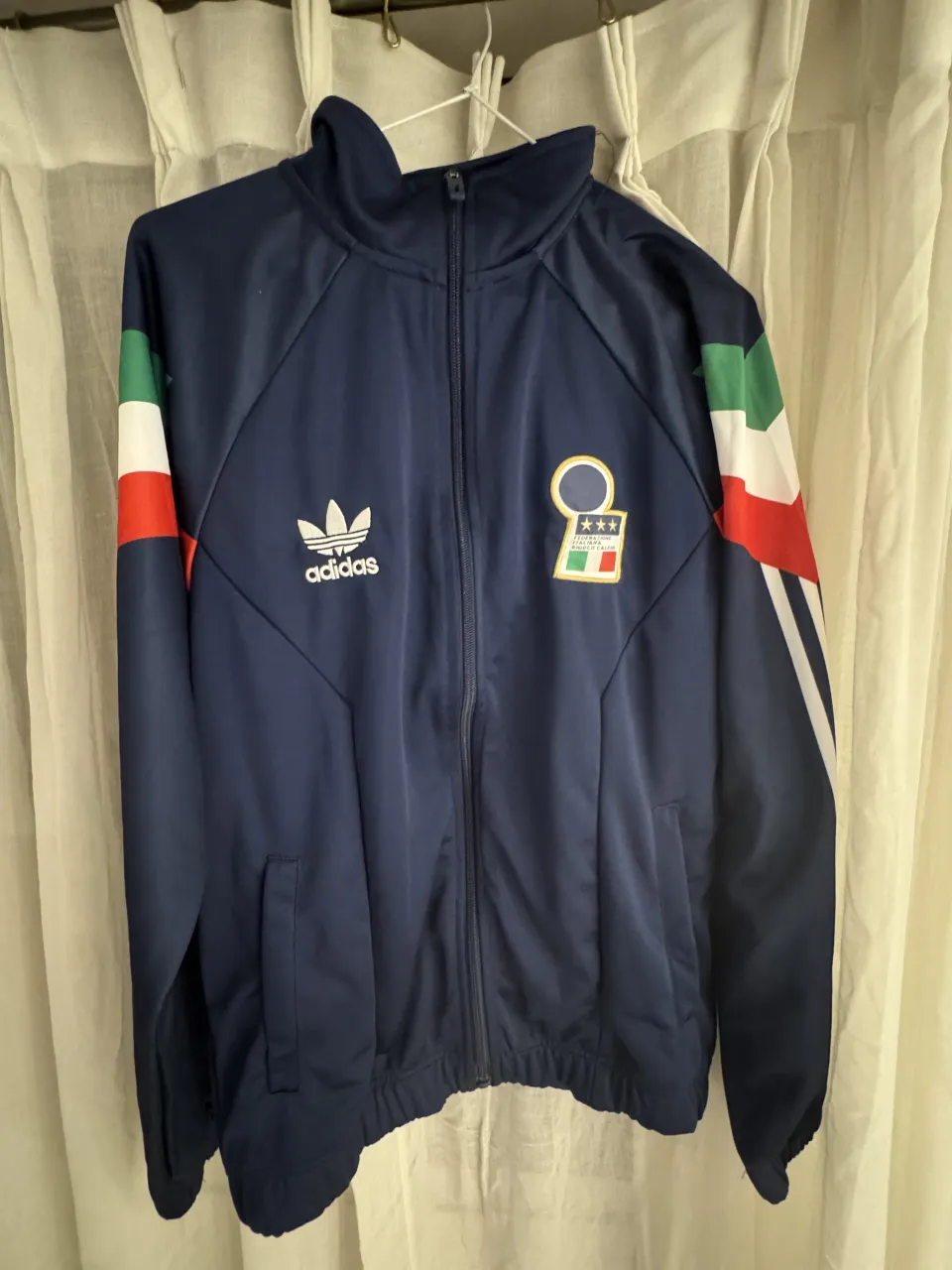 Campera deportiva retro azul con detalles tricolor en las mangas y escudo de la Federación Italiana de Fútbol. Logo de Adidas Originals bordado en el frente.