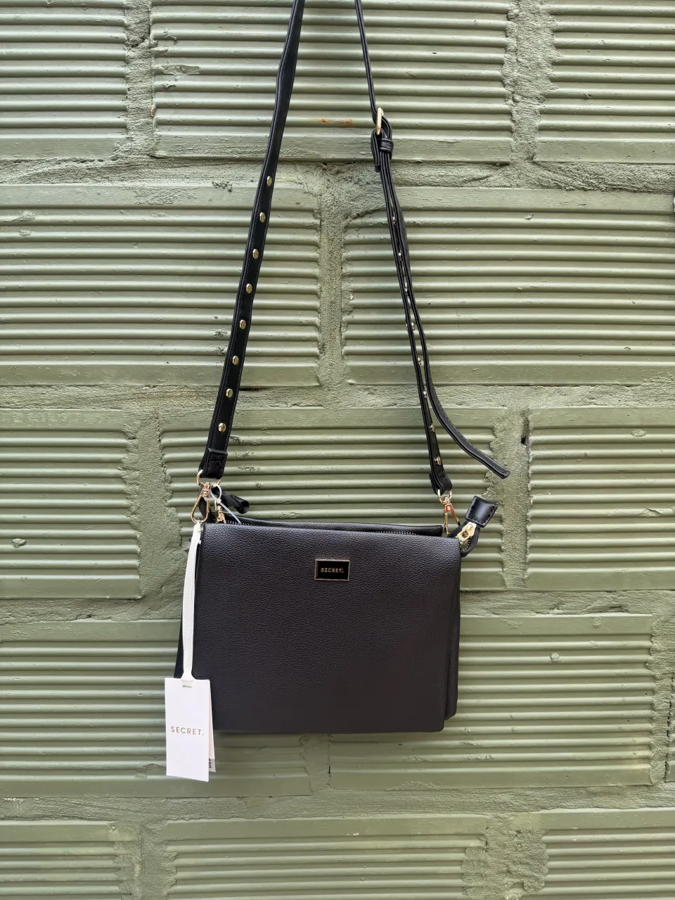 Cartera negra de cuero sintético con correa ajustable y tachas doradas. Posee múltiples compartimentos internos y un bolsillo exterior con cierre.