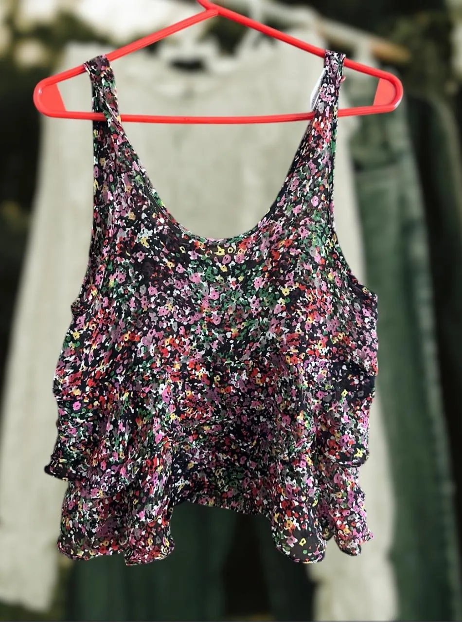 Musculosa estampada con flores pequeñas en tonos vibrantes sobre fondo negro. Posee volados en el ruedo y un detalle de botón en la espalda.