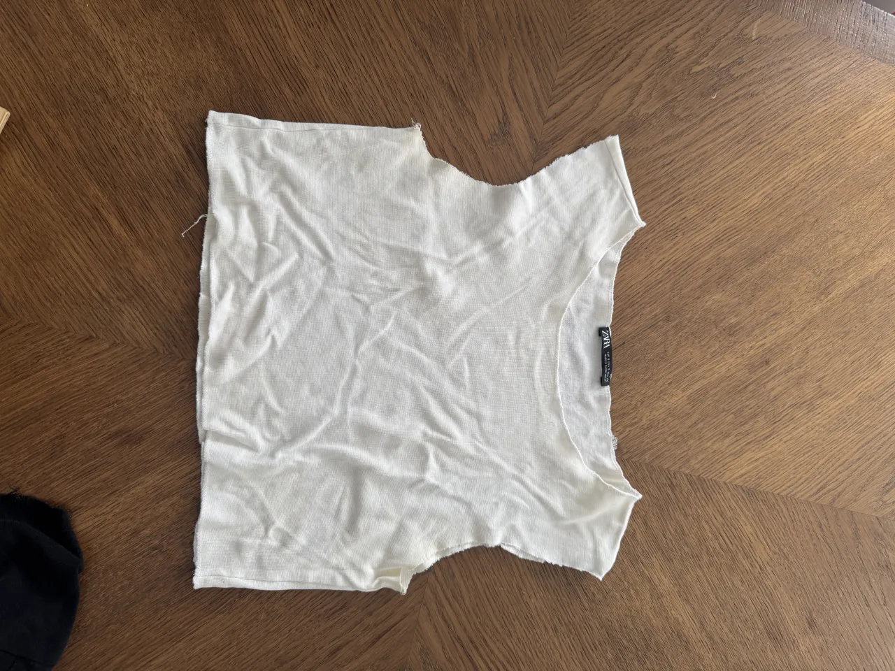 Remera blanca de manga corta con cuello redondo y terminaciones deshilachadas.
