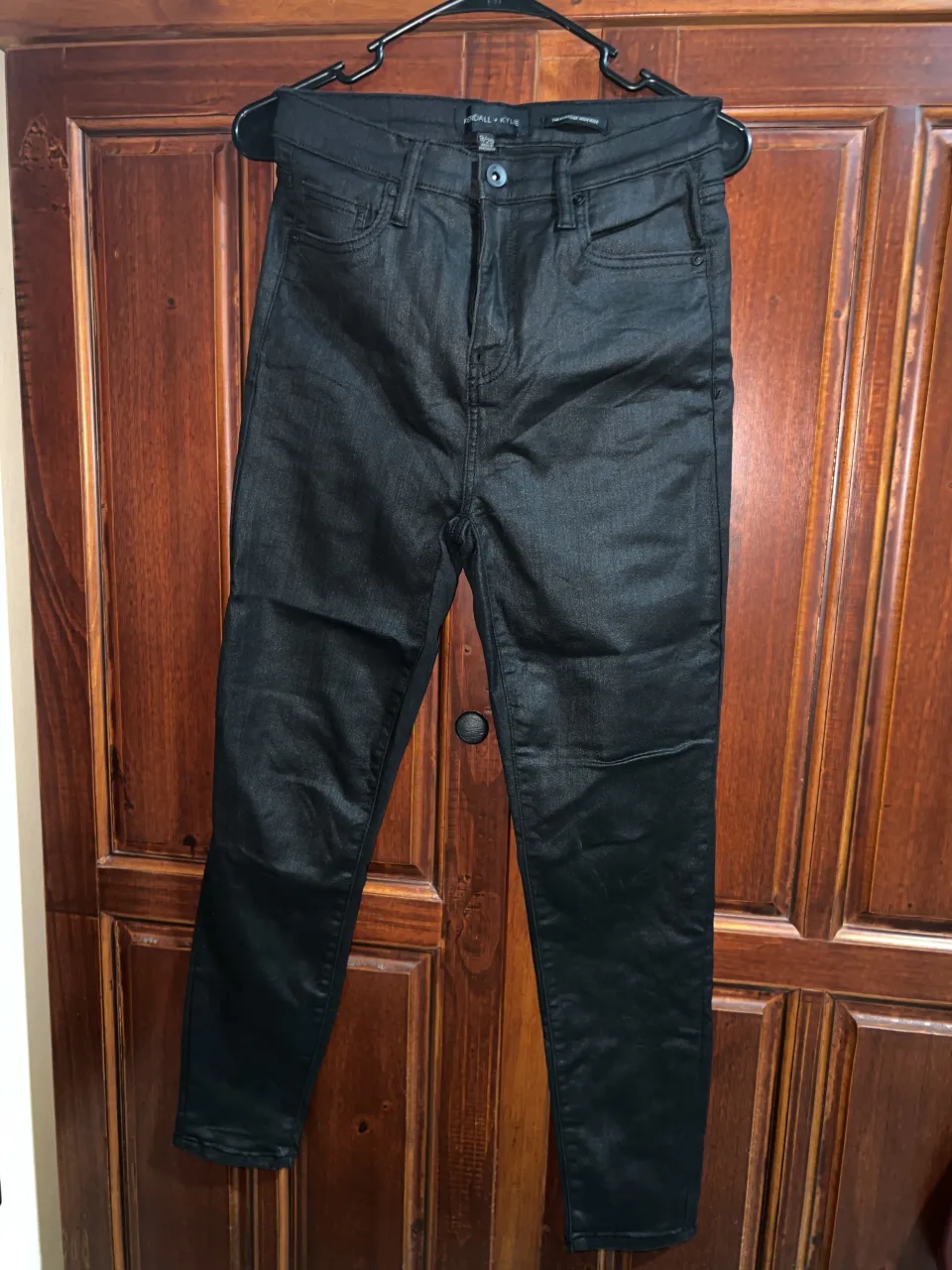 Pantalón chupín símil cuero negro tiro alto con efecto brillante. Cuentan con cierre y botón en la parte delantera, y bolsillos.