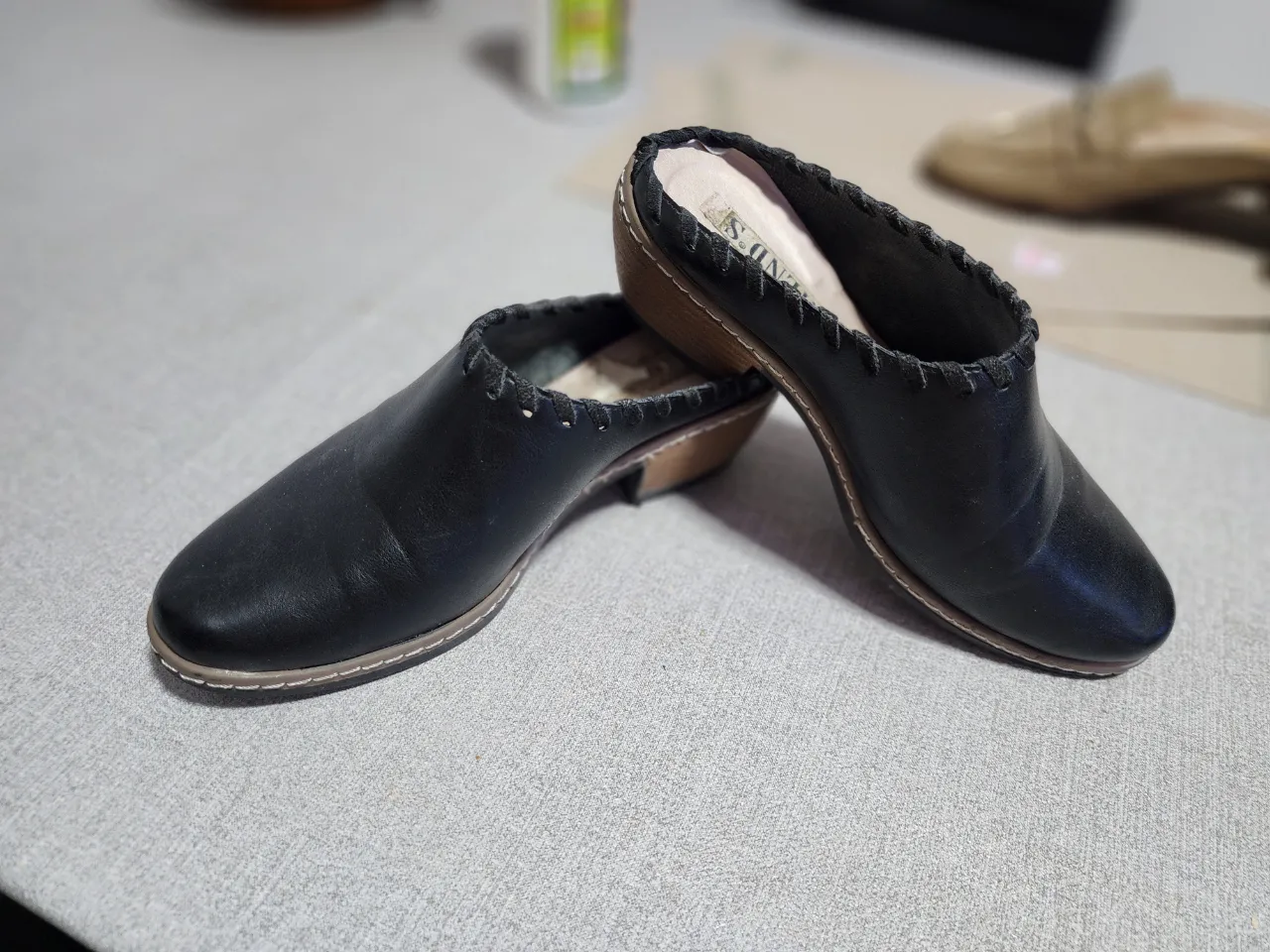 Zuecos negros con costuras decorativas en el borde superior. Taco de madera.