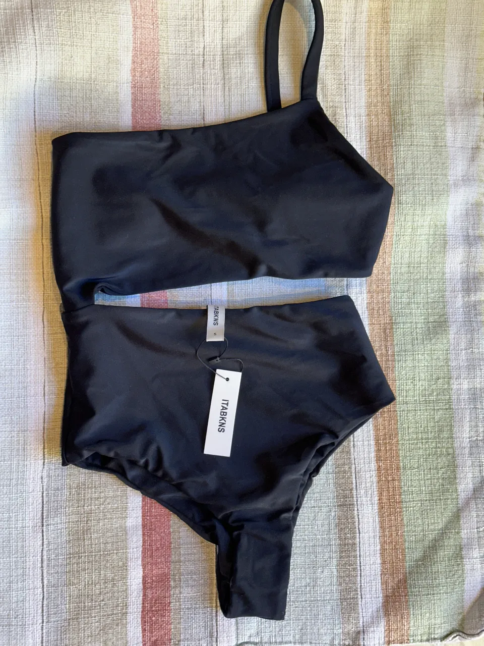Traje de baño negro de una sola pieza con corte asimétrico. Diseño moderno y elegante, ideal para lucir en la playa o la piscina. La parte superior tiene un solo bretel y la parte inferior es tiro alto.