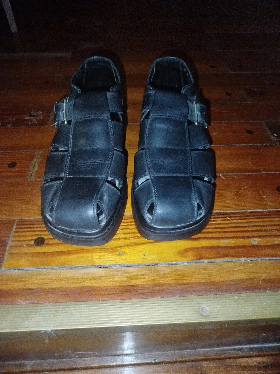 Sandalias negras de cuero con tiras y hebilla metálica.
