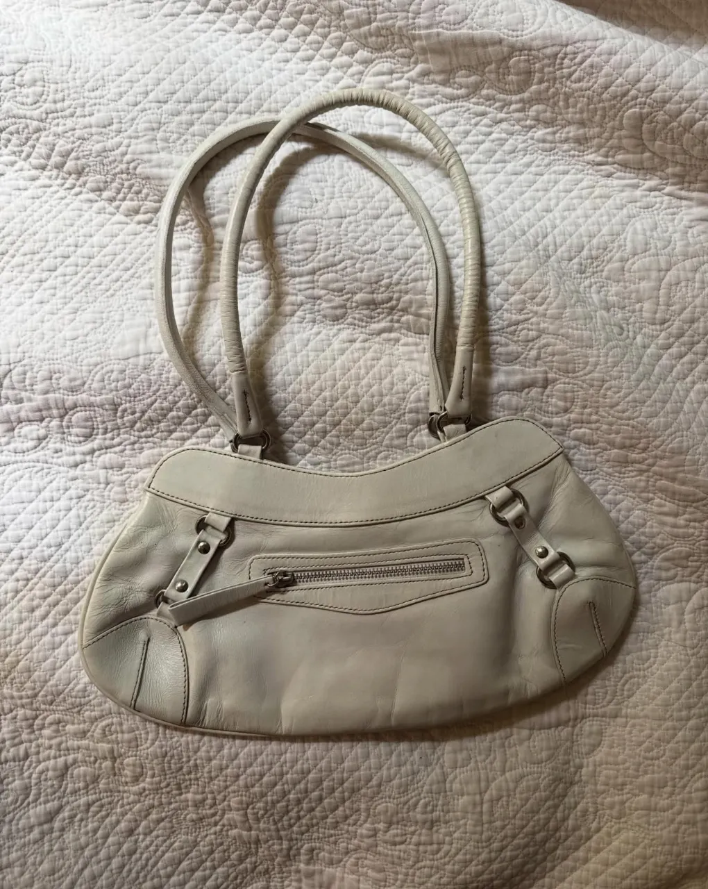 Marca Ayres vintage. Bolso blanco de cuero, con dos manijas cortas y un bolsillo exterior con cierre.