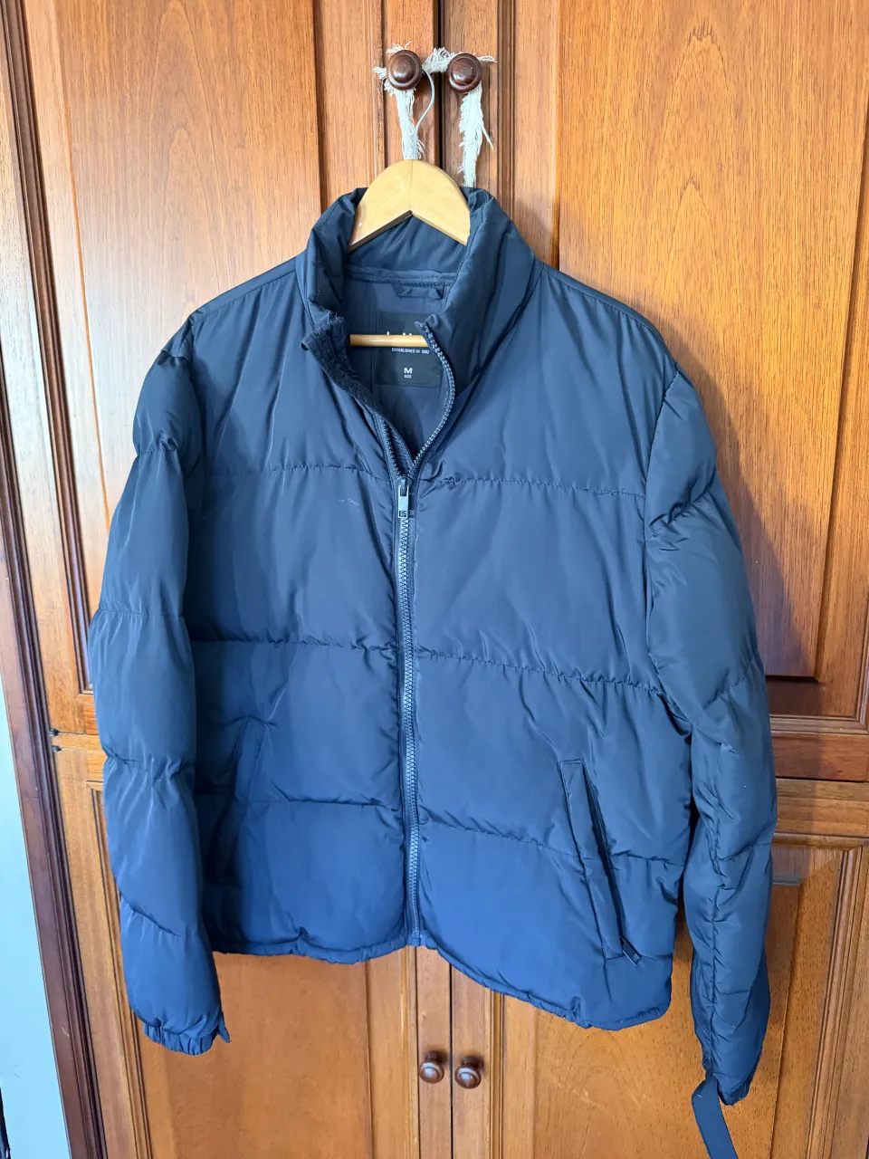 Campera acolchada azul marino con cuello alto y cierre completo. Posee bolsillos laterales con cierre.
