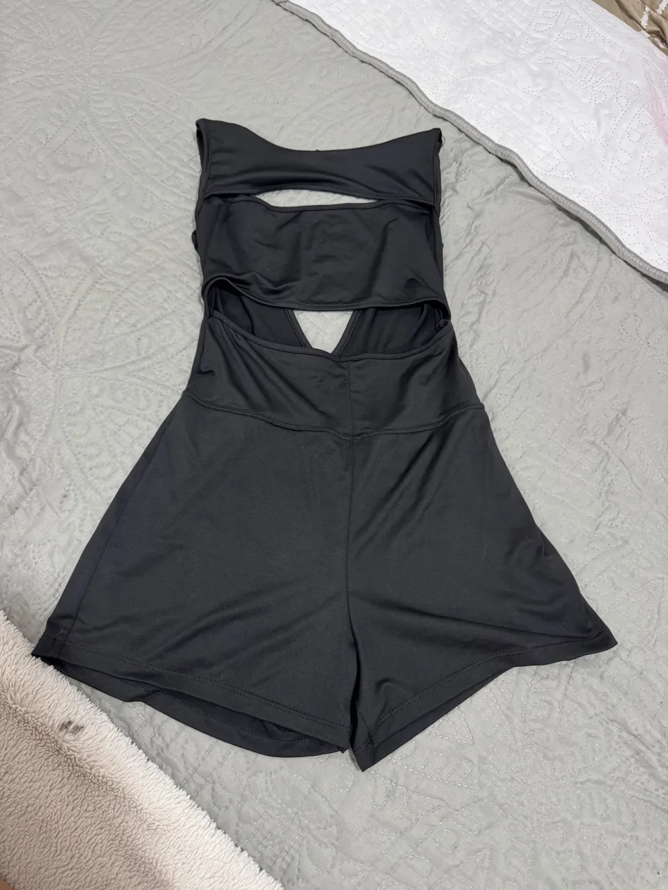 Mono deportivo negro con recortes en el torso y shorts.