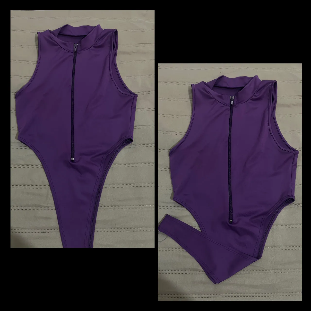 Body de color violeta cavado, con cuello alto y cierre completo en el frente. Sin mangas.