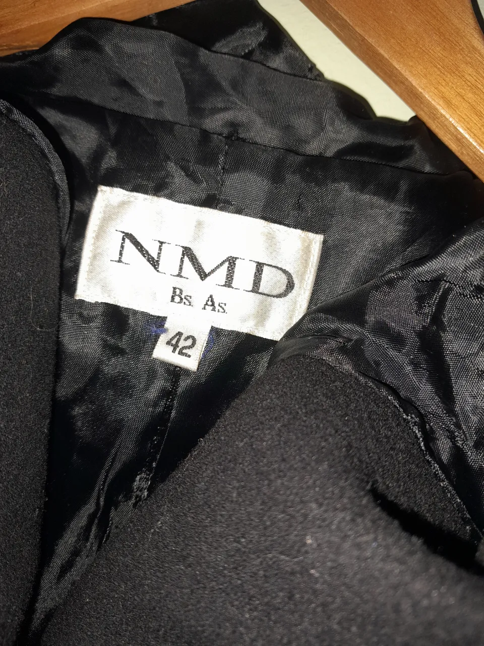 Abrigo negro largo con capucha y tres botones al frente. Posee bolsillos laterales.