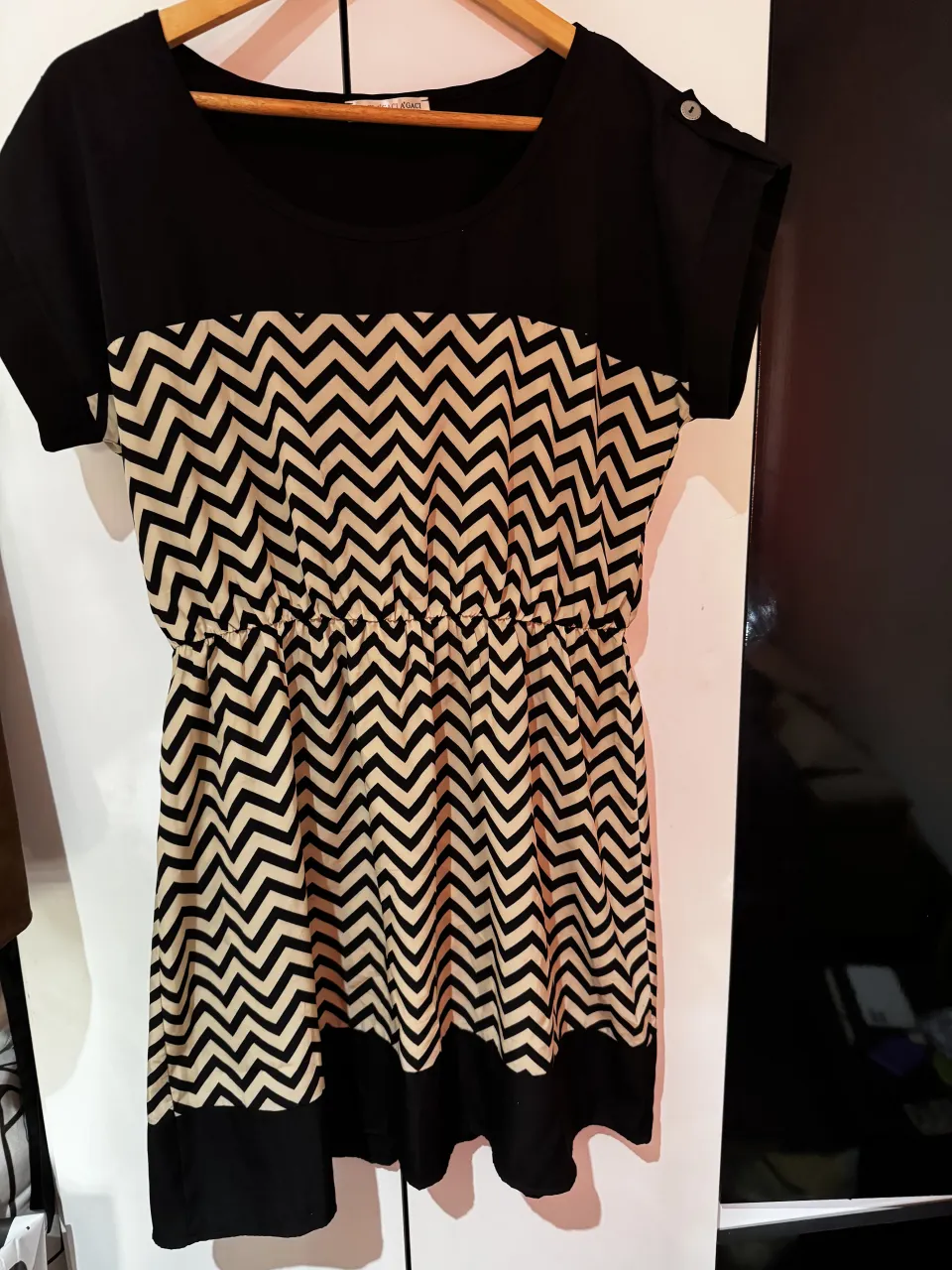 Vestido corto con estampa zig-zag en blanco y negro. Posee mangas cortas y cintura elastizada. Ideal para un look casual y moderno. importado, marca Agaci