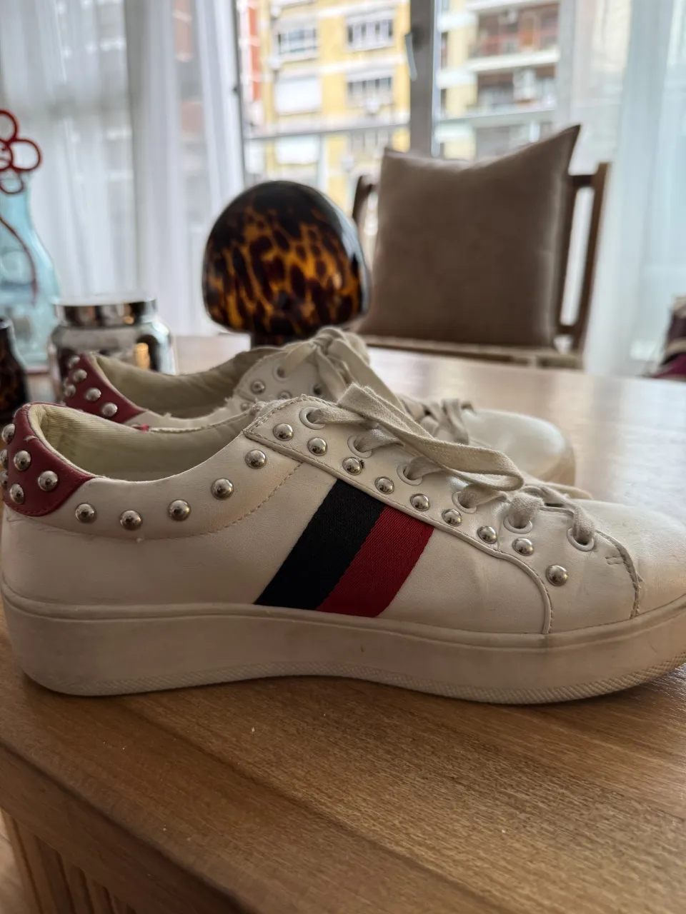 Zapatillas blancas con cordones, tachas plateadas y detalles en rojo y negro en el talón y en la franja lateral.