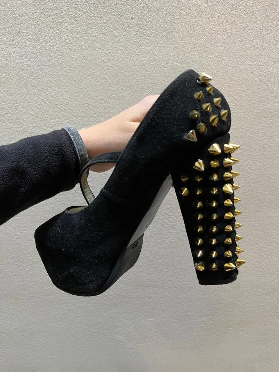 Zapatos de plataforma negros con taco alto y detalles de tachas doradas. Tienen una tira con hebilla que cruza el empeine, dándole un toque rockero y audaz. Ideales para destacar en cualquier salida nocturna o evento especial.