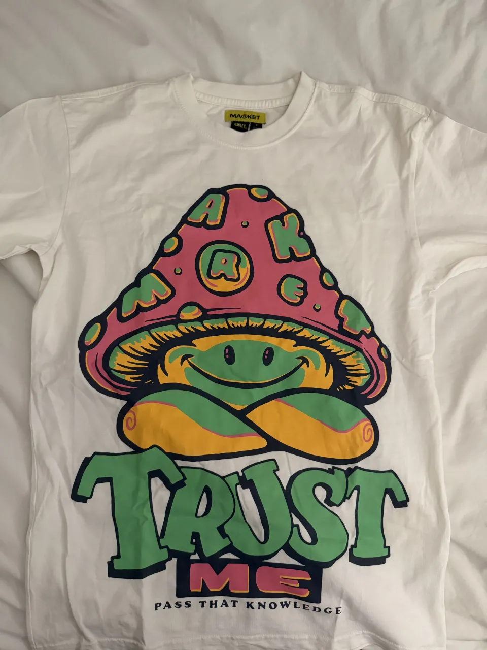 Remera blanca con estampa de un hongo sonriente con la inscripción "TRUST ME" y "PASS THAT KNOWLEDGE".