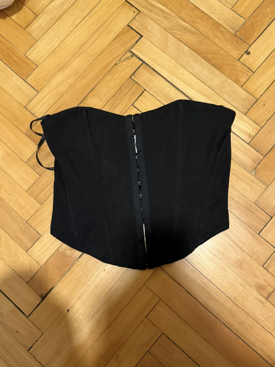 Top negro con ballenas y ganchos en la parte delantera. Posee tiras finas.