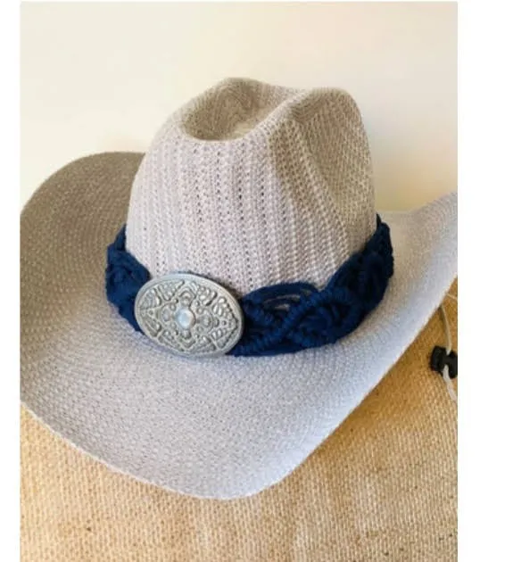 Sombrero de paja tejido, estilo cowboy, con un detalle de cinta trenzada azul marino y un broche plateado con diseño intrincado. Ideal para protegerse del sol con estilo.