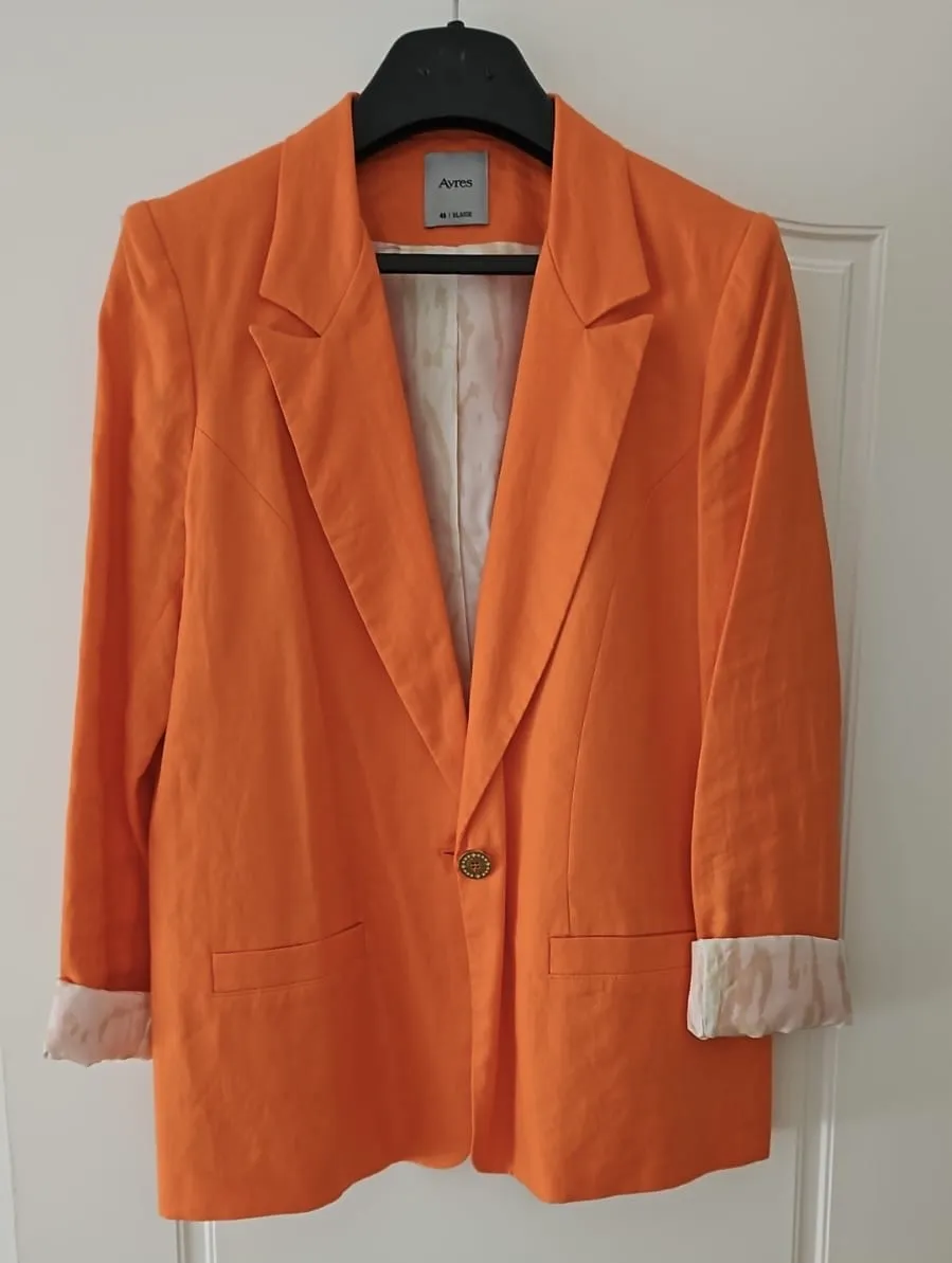 Blazer naranja vibrante, ideal para darle un toque de color a cualquier outfit. Con un diseño clásico y un corte moderno, es perfecto para lucir elegante y a la moda. Su forro interior estampado le da un detalle único y sofisticado.