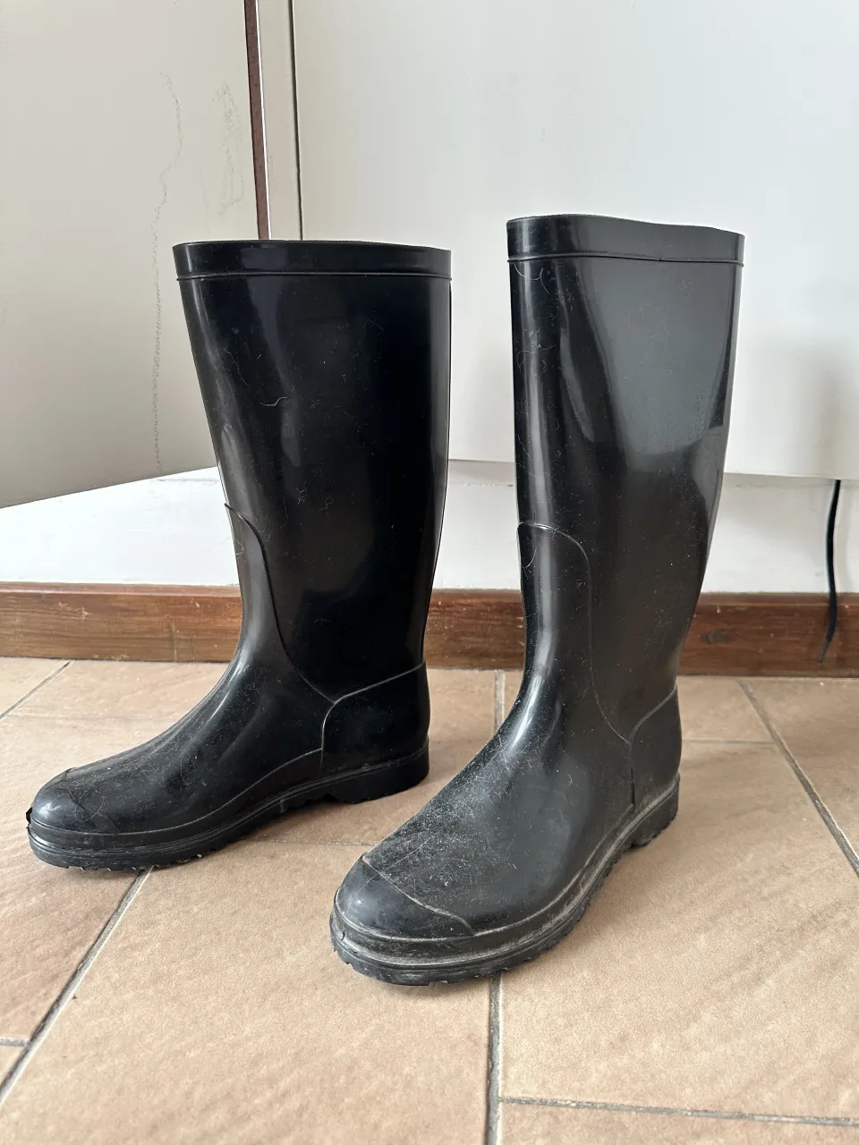 Botas de lluvia negras de caña alta. Suela con relieve para mayor agarre.