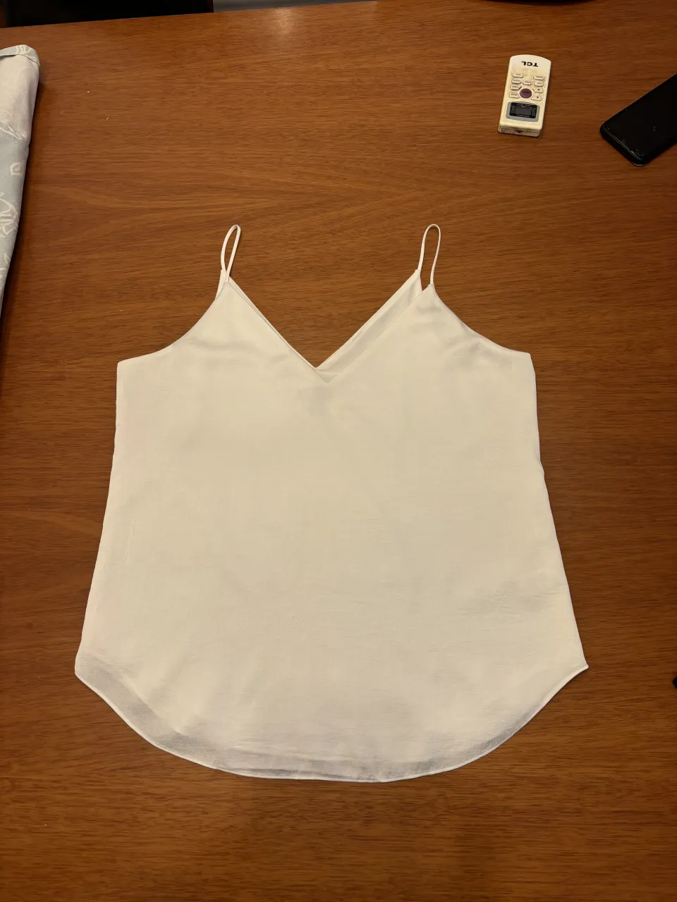 Musculosa blanca de breteles finos, escote en V. Ideal para usar sola o como base de un outfit. Fotos frente y dorso. Sirve tanto como formal y casual. No es opaca sino mas bien tirando a crepe satinado