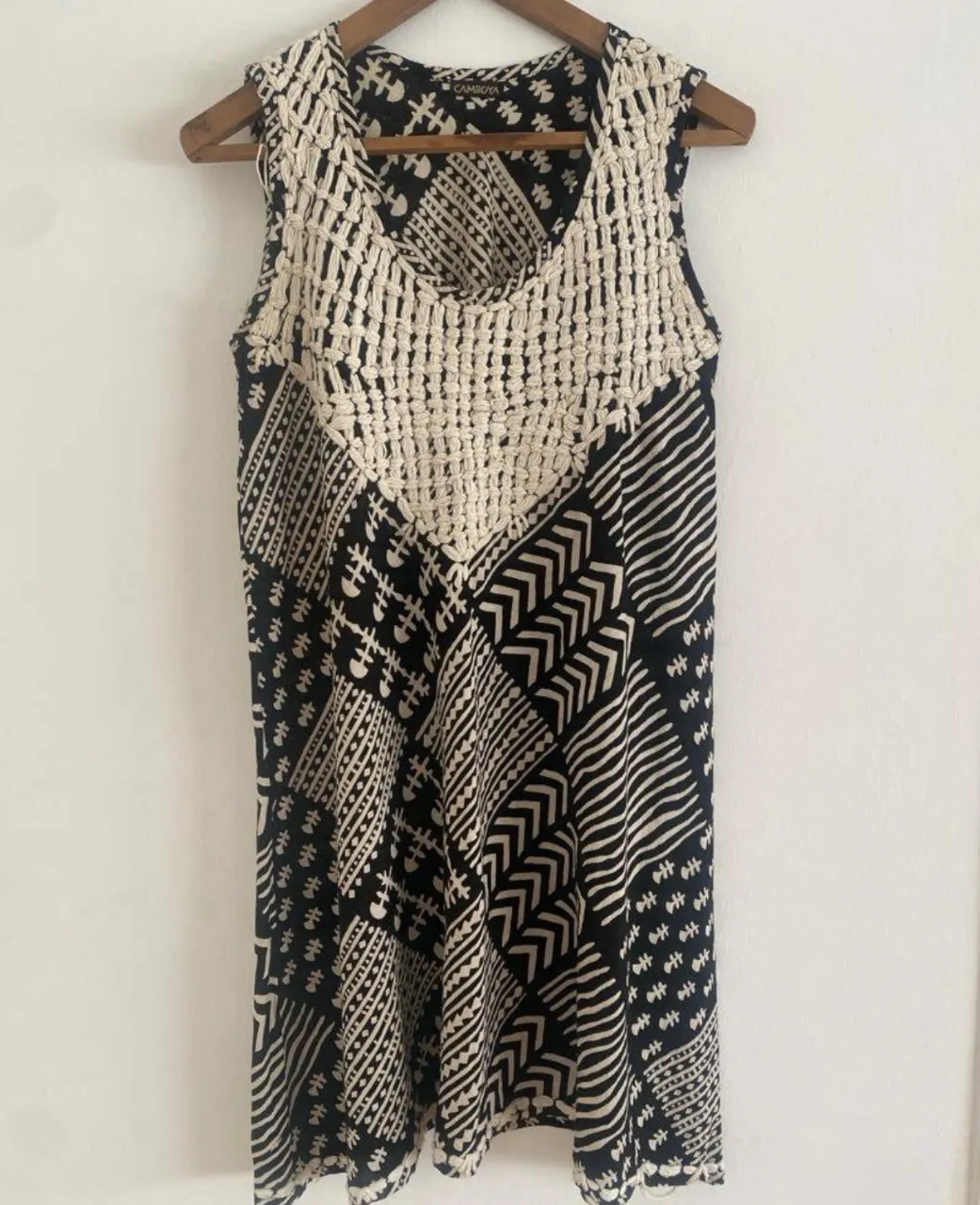 Vestido corto de tela con estampado geométrico en blanco y negro. Posee un detalle de macramé en el escote y los hombros. Ideal para un look boho chic. la última foto muestro el tejido entramado por el interior