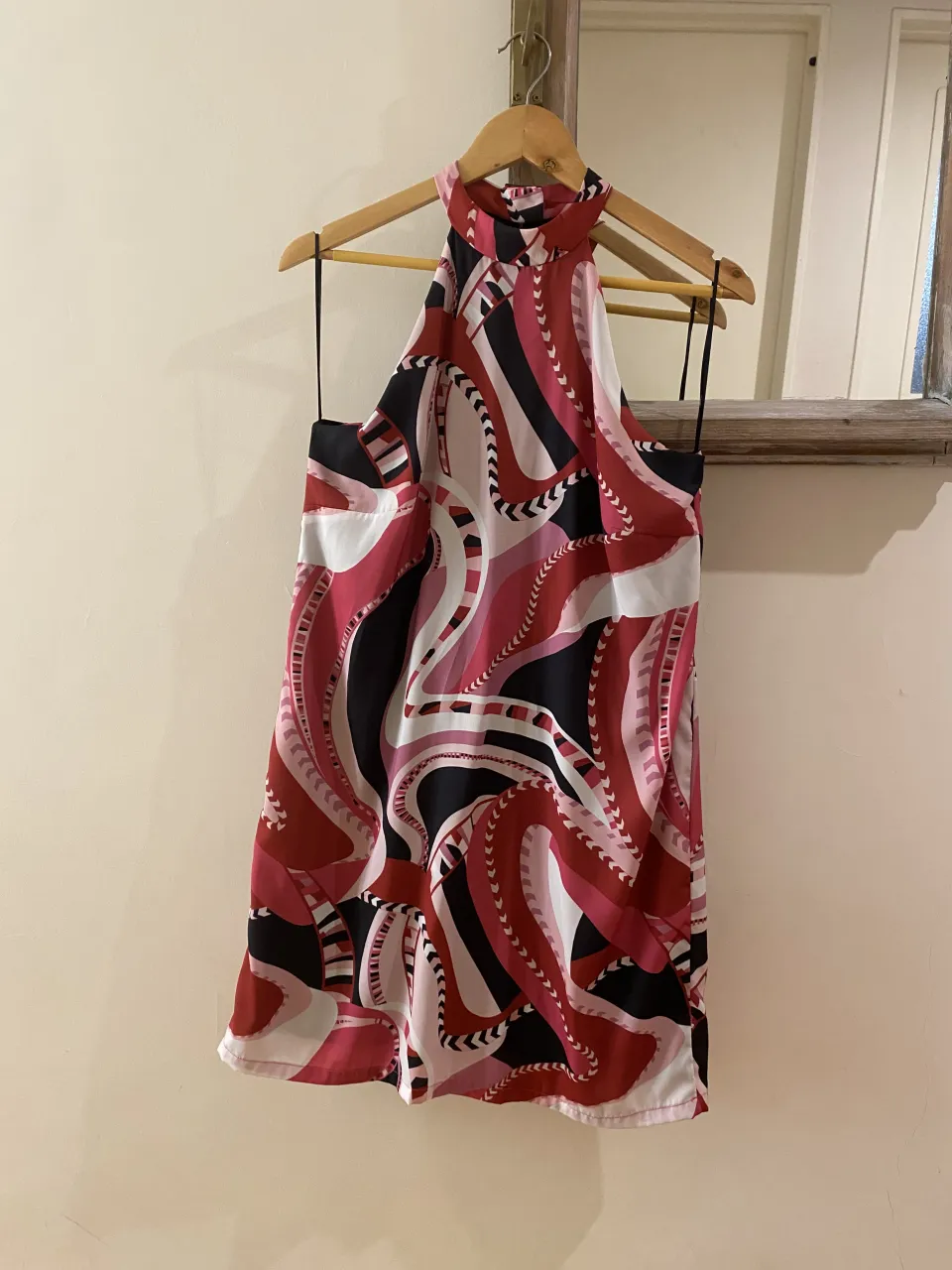 Vestido corto con estampado en tonos bordó, rosas, blancos y negros. Diseño con cuello alto y detalles de botones en la nuca. Ideal para eventos de día o noche. Tiene cierre en un costado y forro de algodón. Pequeño detalle (ultima foto).
