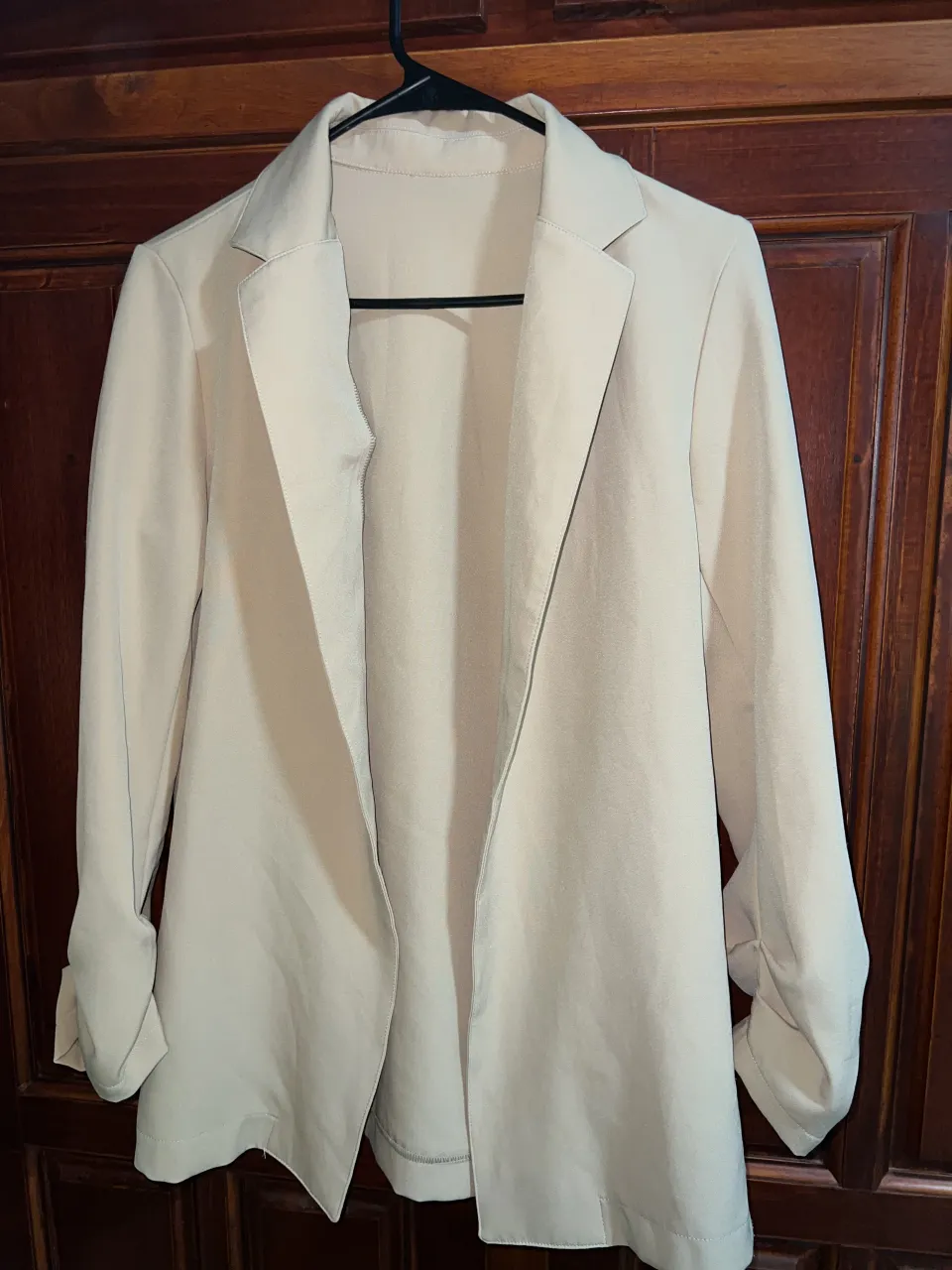 Blazer color crudo, sin botones, con solapas y mangas largas con frunces. Para primavera/ media estación.