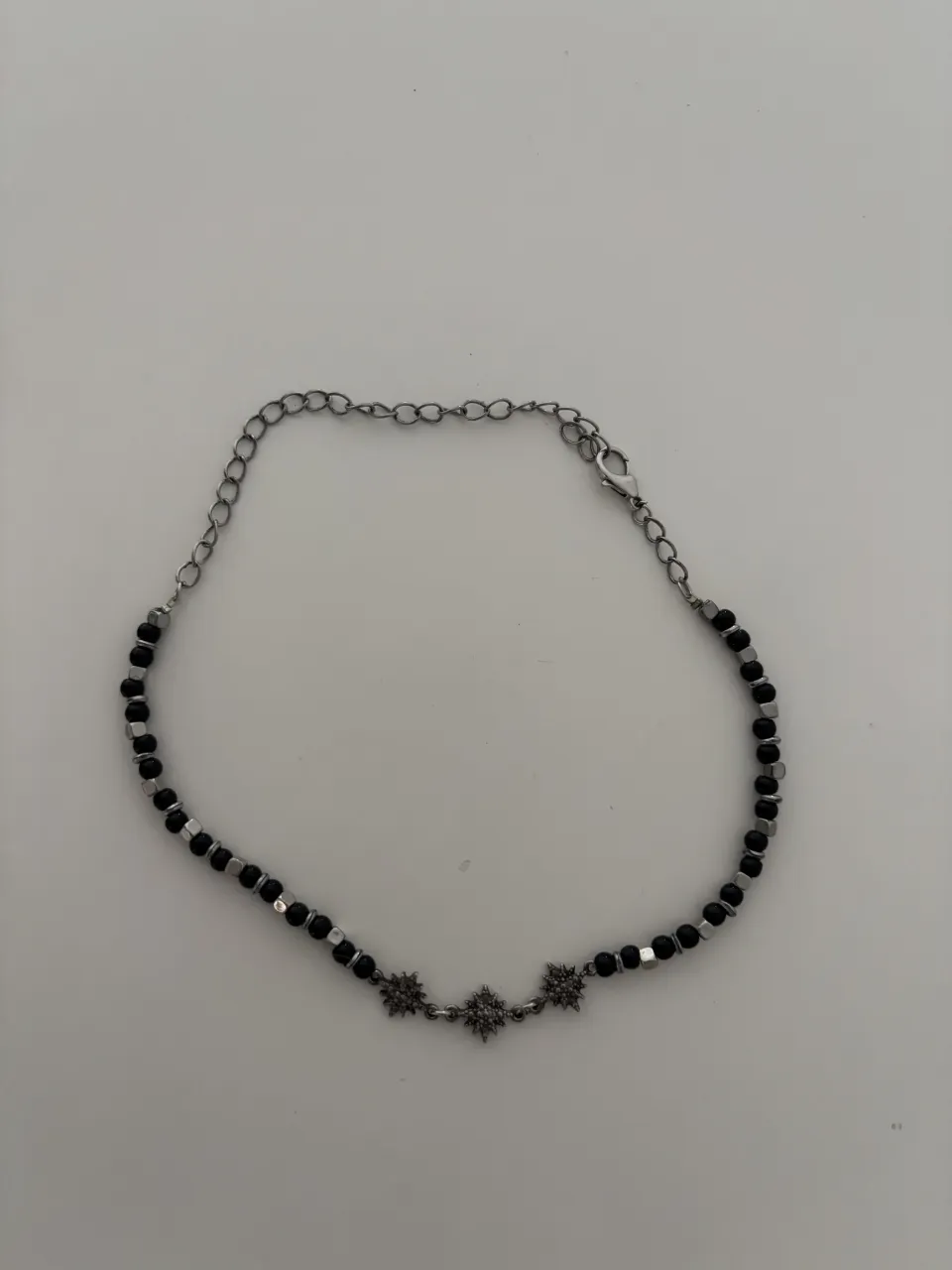 Collar con cadena plateada y cuentas negras y plateadas. Tiene tres dijes en forma de estrella con detalles brillantes.