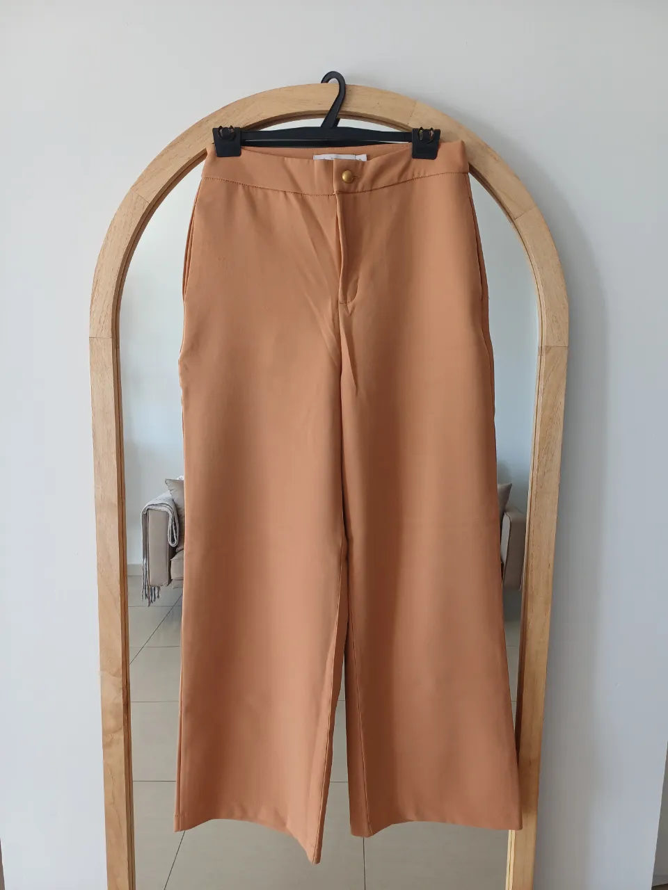 Pantalón sastrero BOON color camel, con un botón dorado y bolsillos delanteros funcionales. Talle S amplio. Referencias: mi cintura mide 70cm y mis caderas 104cm.