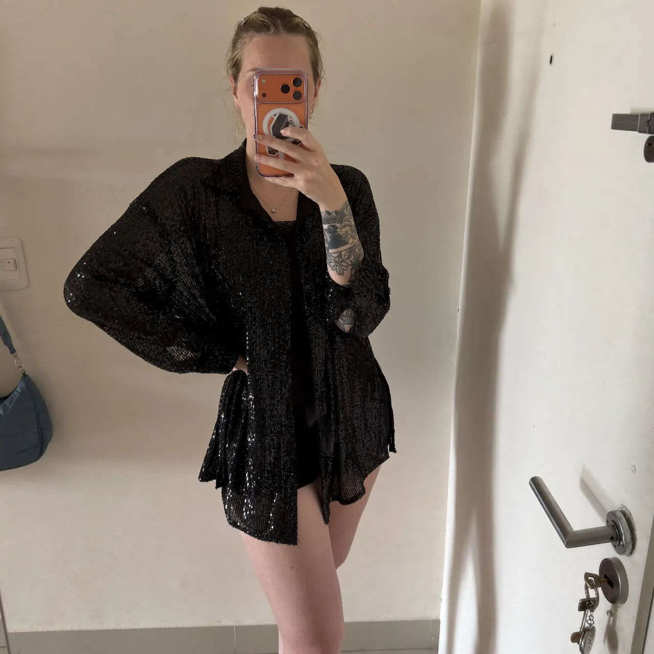 Camisa negra con lentejuelas un poco transparente, oversize. 1 solo uso. Talle único pero es grande, podría ser como un L para tener de referencia.