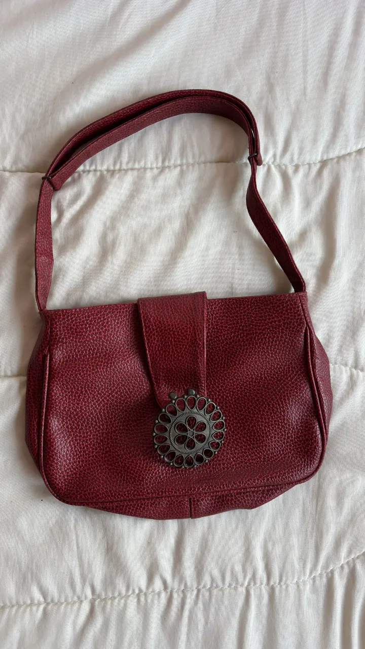 Cartera de cuero color bordó con detalle metálico circular en la parte frontal. Posee cierre.