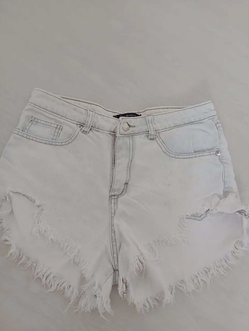 Short de jean blanco con detalles desflecados. Ideal para un look casual y fresco.