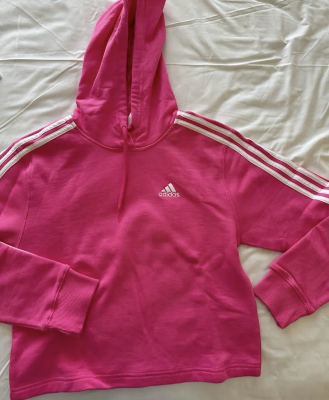 Buzo crop de algodón color rosa con capucha y cordones. Tiene el logo de Adidas y las tres tiras blancas en las mangas.
