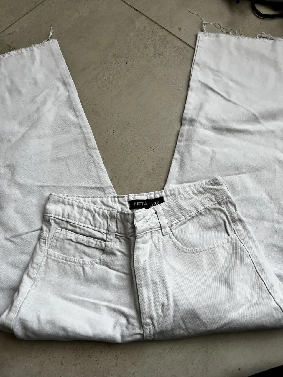 Pantalones de jean blancos con roturas en los bordes inferiores.